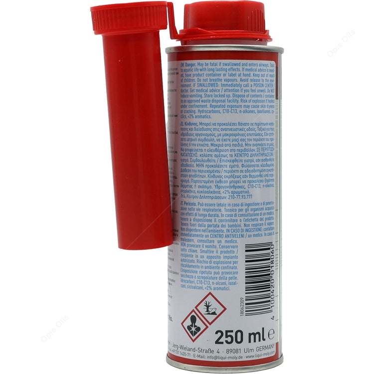Suitable for all diesel engines with and without a diesel particulate filter. Preventive or remedial. Fully compatible with all conventional diesel and biodiesel fuels. 250 ml is sufficient for up to 75 l of fuel (dosage 1:300). Effect remains for up to 2,000 km. Tested for compatibility with turbochargers.