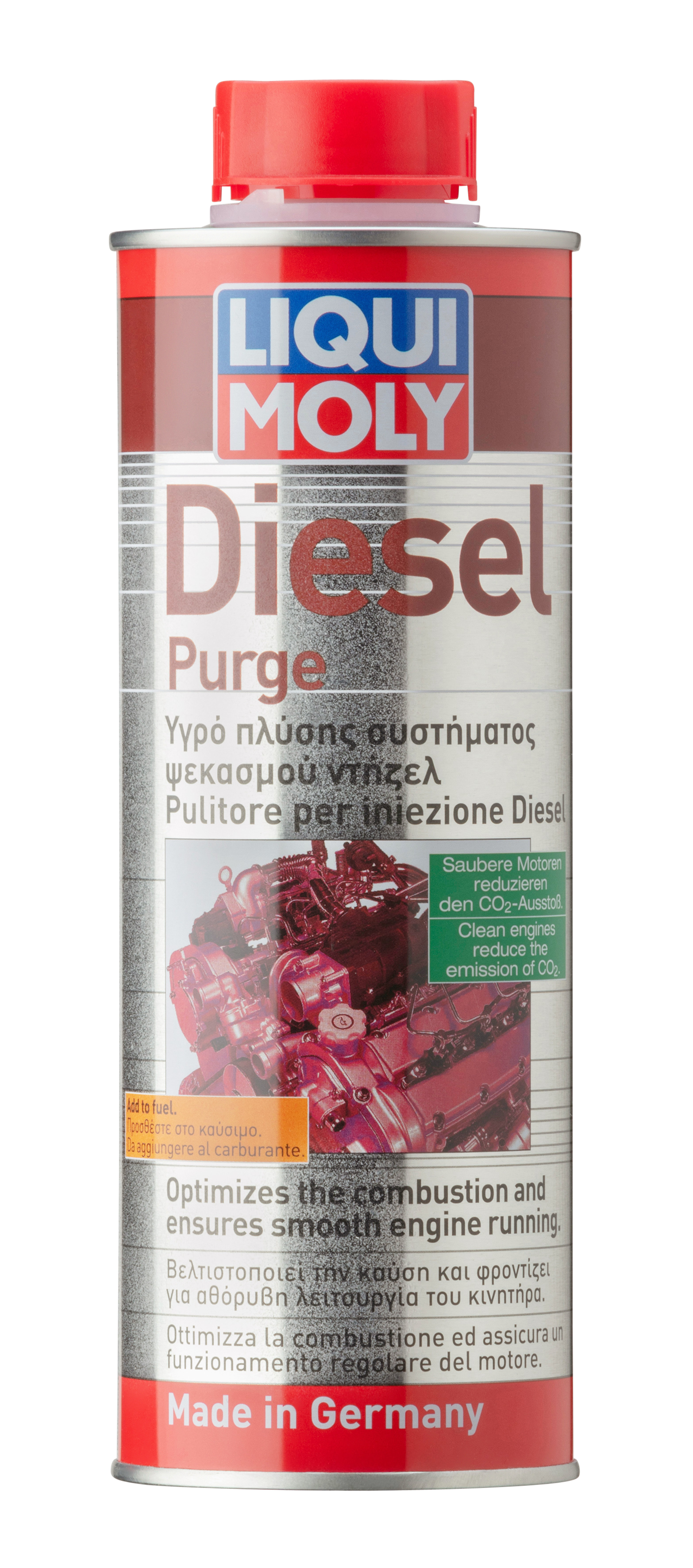 Removes deposits on injection nozzles and in the combustion chamber. Boosts the cetane number. Eliminates engine running problems such as knocking when idling and ensures smooth and quiet engine running. Protects the entire fuel system against corrosion. Optimizes the emission test values. Can also be used preventively. Clean engines use less fuel and reduce the pollutant emissions.