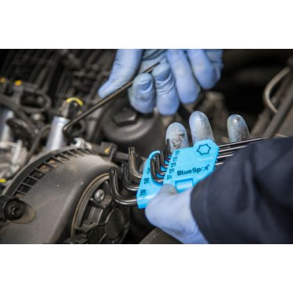 The Blue Spot Tools 9 PCE Long Arm Torx Key Set (T10-T50) is manufactured from chrome vanadium for increased durability. The keys feature a black oxide coating to aid corrosion resistance and the extra length enables you to get a greater amount of torque onto the fastener you are working on. The tips are also chamfered for ease of entry.