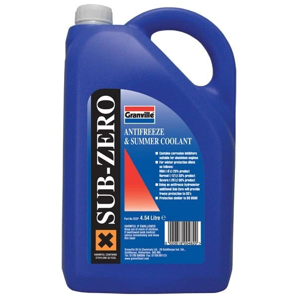 Granville Sub-Zero Blue Antifreeze is a Monoethylene Glycol based antifreeze that does not contain nitrates,amines or phosphates. Sub-Zero Blue Antifreeze contains corrosion inhibitors suitable for aluminium engines and is suitable for use in petrol and diesel engines.