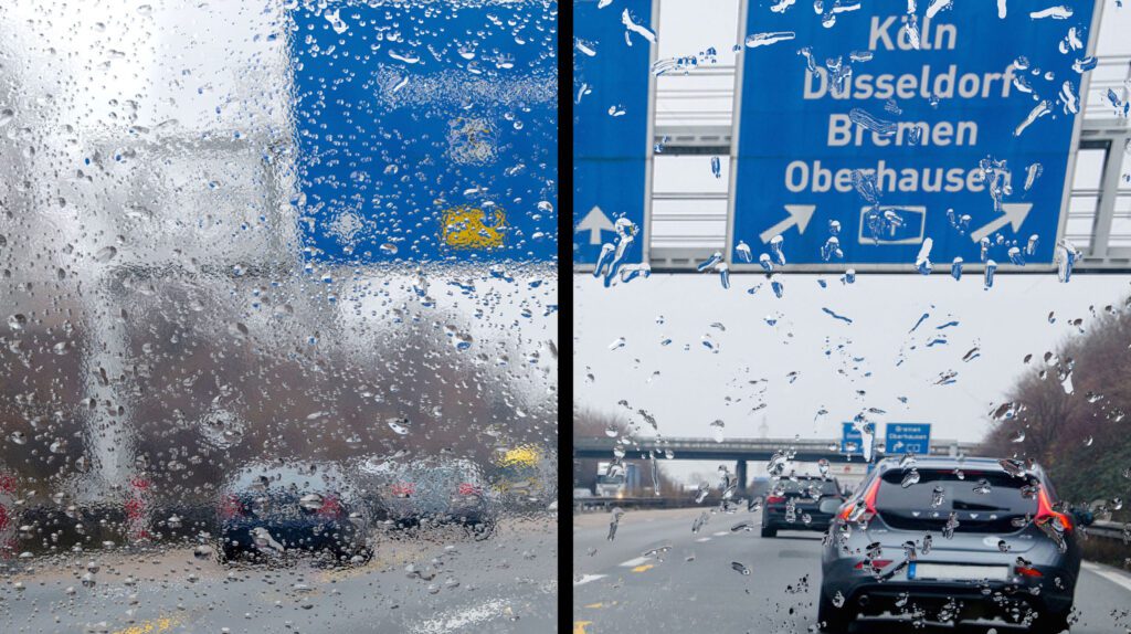 Discover the water-repellent principle of our innovative product. Thanks to our unique water-repellent additive, the surface tension of water droplets falling on your windows is modified. This increases the angle of contact and allows the droplets to return to their original circular shape, which has two immediately beneficial effects: