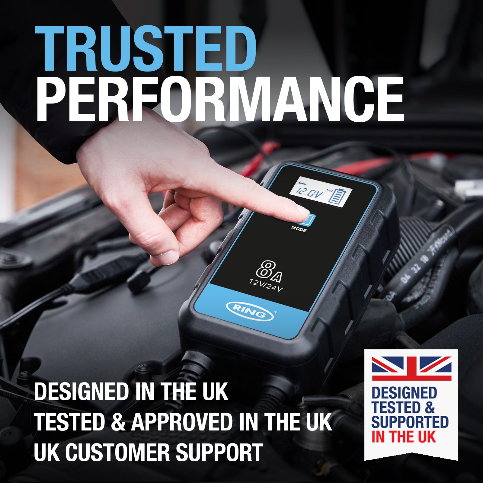 Built with safety in mind, the RSC908 charger features polarity and short circuit protection, protecting both the user and their battery. The intelligent one-touch charging automatically transitions into maintenance mode once the battery is full, ensuring the battery is never overcharged and remains in optimum condition.
