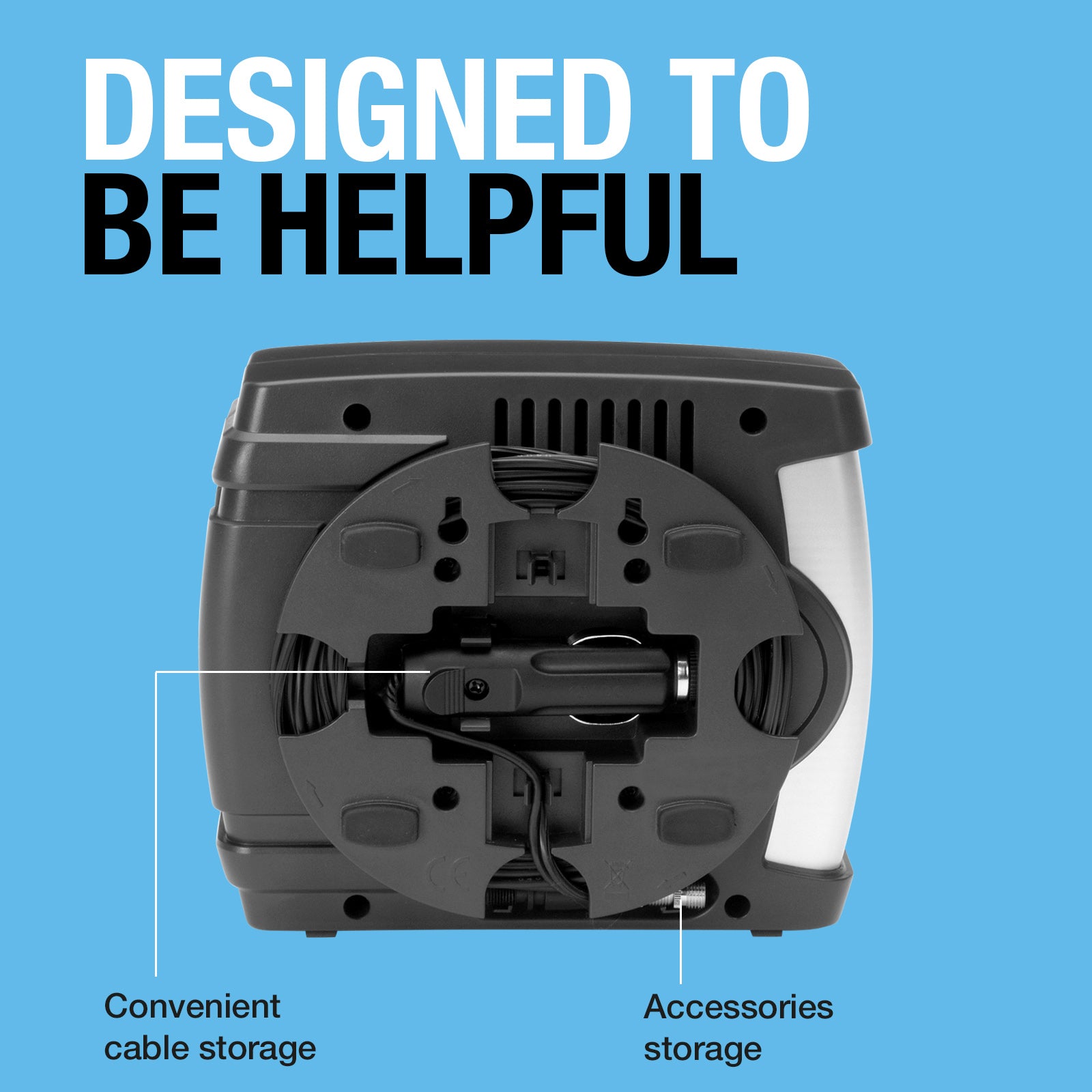 RAC610 analogue tyre inflator with three piece adaptor kit ideal for inflating sport balls and small inflatables. The inflator comes fitted with a fused 12V power plug and approx. 2.9m cable that stretches the full length of a standard car, allowing back tyres to be easily reached and checked. Inflates a tyre to 35PSI in under 4.5 min - saving you time. The gauge displays pressure in PSI, kg/cm2 or BAR for reliable and accurate performance.