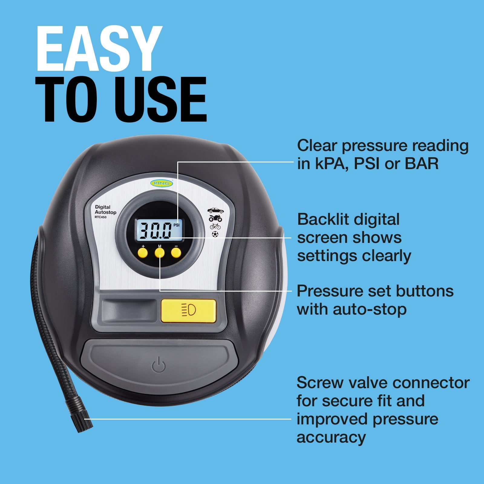 The RTC450 Digital Auto-Stop Tyre Inflator is simple to use and set; simply select the pressure measurement (psi, BAR or kPA) use the +/- buttons to set the pressure you require, then press the large on/off button. The auto-stop function ensures that the device will stop inflating the tyre when the required pressure is met, and the screw valve connector ensures a secure fit and pressure accuracy.