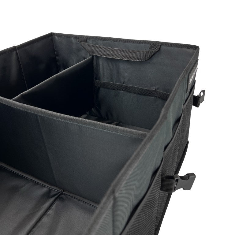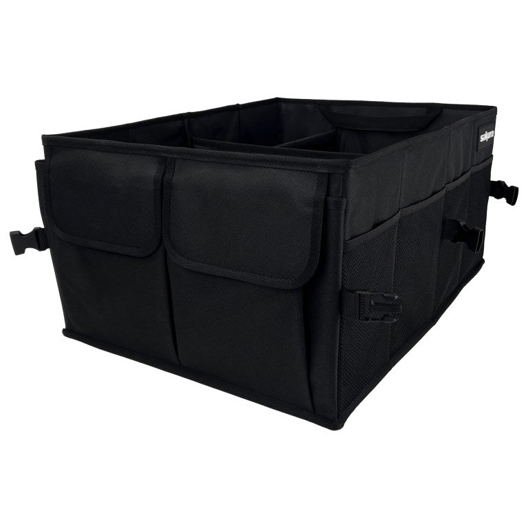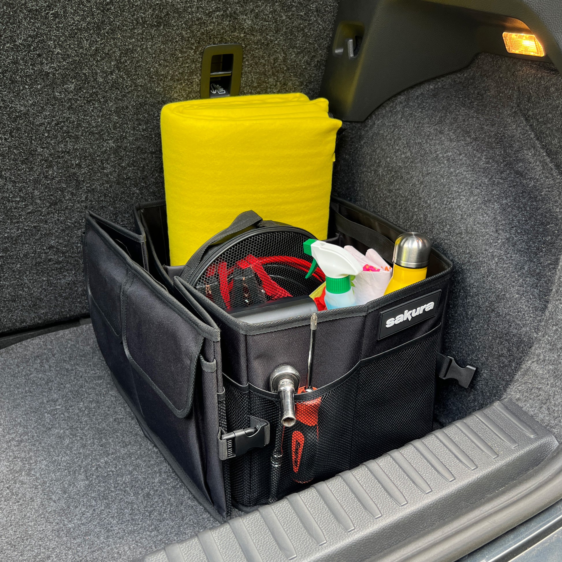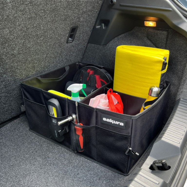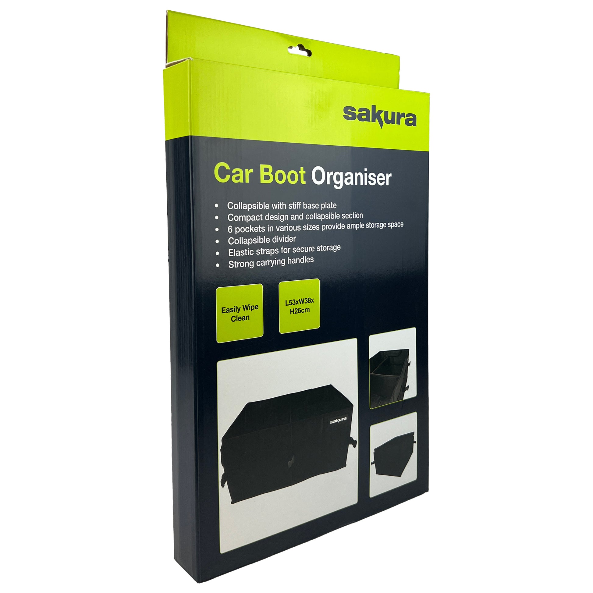 The Sakura Car Boot Organiser provides convenient storage for your vehicle. It is collapsible with a stiff base plate for easy storage. The compact design and collapsible section allows for customised organisation. The useful 6 pockets and elastic straps for secure storage are ideal for those important items. With dimensions of L53xW38xH26cm, it offers ample space. The organiser features strong carrying handles and is built to be durable. Keep your car tidy and belongings secure with the Sakura Car Boot Organiser.