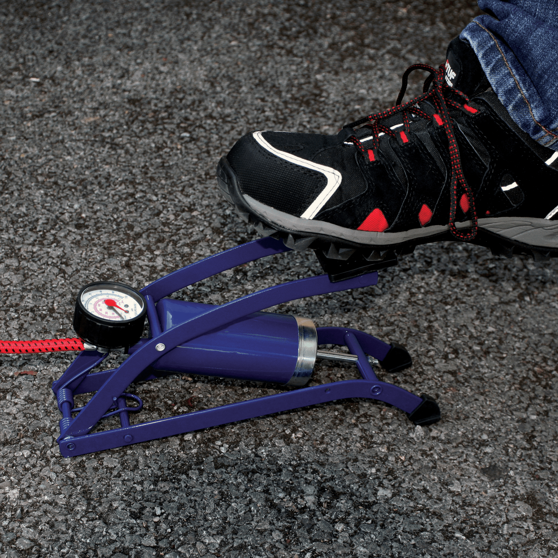 Features a heavy duty 52cm hose, with thumb lock and non-slip tread plate for stability. Also includes a red marker needle pressure gauge for accurate inflating.