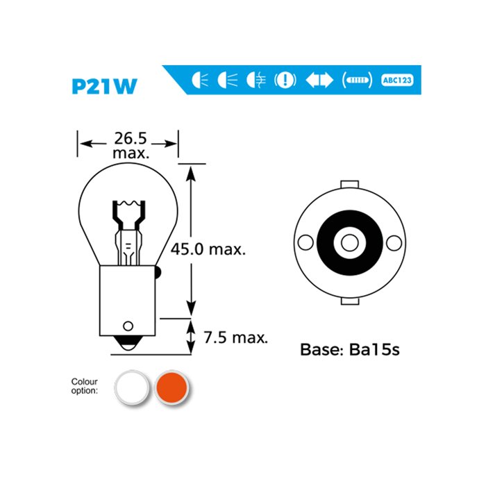 Manufactured to o.e. specification All of our Simply Auto range of bulbs are meticulously manufactured to an O.E. (Original Equipment) specification. The bulbs are made to the same blueprint as the factory-fitted originals, providing an exceptional value direct replacement. If you’re unsure what type of bulb you need to change, we would advise that you check your vehicle’s handbook. Extensive range of quality bulbs Simply’s extensive range of automotive light bulbs are carefully created for a long-lasting, high performance quality driving experience, range from headlight to gas discharge, auxiliary, and chrome bulbs. Your driving needs and safety are our greatest concern. Safe protective packaging All of our bulbs come conveniently housed in secure, durable packaging specially selected to protect your new vehicle light bulbs from any unwanted damage. For instance, our individually boxed halogen and gas discharge headlight bulbs are packaged with a foam sleeve over the bulb. Even our multipack boxes are carefully packaged with either heavy duty grip seal bags for our small festoon bulbs or in a rigid vacuum formed tray for our larger auxiliary bulbs. Highly durable Our range of bulbs resist thermal shock and adverse weather conditions, making them last for longer. E marked The quality of this bulb is ECE (E4) approved for safe use on public roads. Bulb specification: Type: PY21W Amber Indicator Bulb Product Dimensions (mm): H 52.5 x W 26.5 Voltage: 12V Wattage: 21W Base: BAU15S