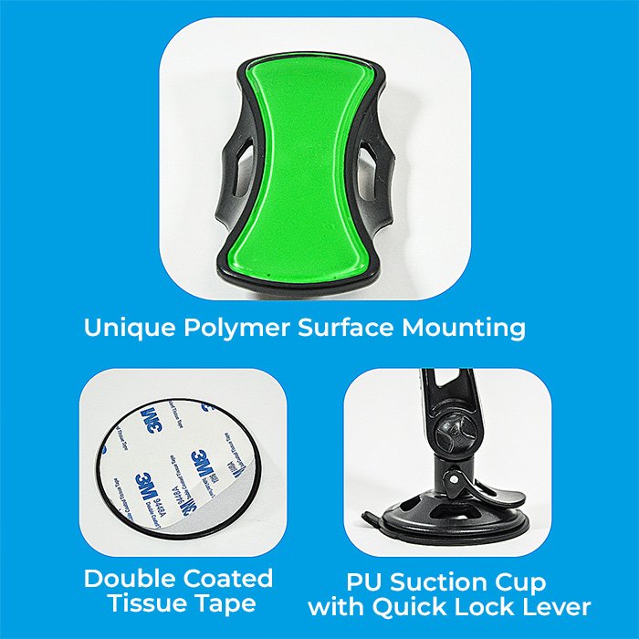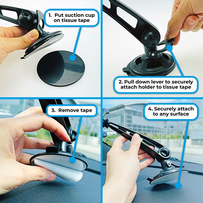 Our phone holder is extremely easy to install once you’ve found an ideal location to mount to, lock the suction cup to securely attach to a surface and adjust the phone mount to fit and clamp your device in place to prevent it from falling out.