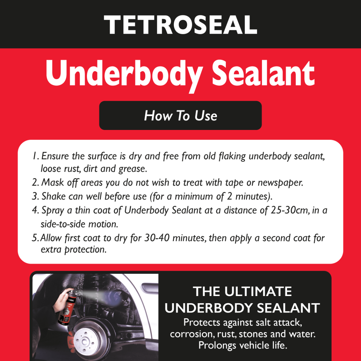 Tetroseal Underbody Sealant is a tough, bitumen-based coating formulated to protect a vehicle’s underside from rust, corrosion, and stone chip damage. It creates a flexible, waterproof layer that withstands road debris, salt, and harsh weather, helping extend the life of your vehicle.